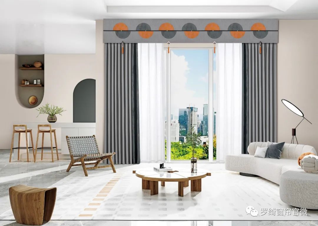 整個窗簾自帶一種東方的朦朧美,大麵積的深灰色和淺灰色塑造一種淡泊意境。橙色的幾處暈染,像極了秋季的驚鴻一瞥。使整個窗簾透露出一種清雅意蘊。包括在細節上的體現,橙色的布料上還搭配著葉片的設計,有一種一葉知秋的畫麵感。