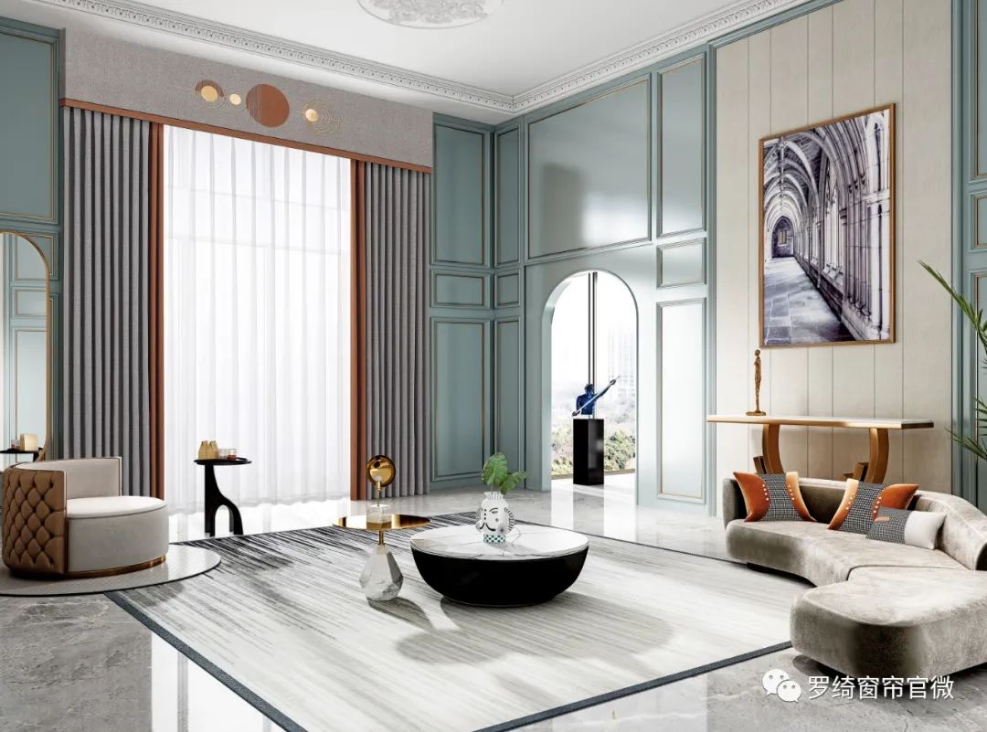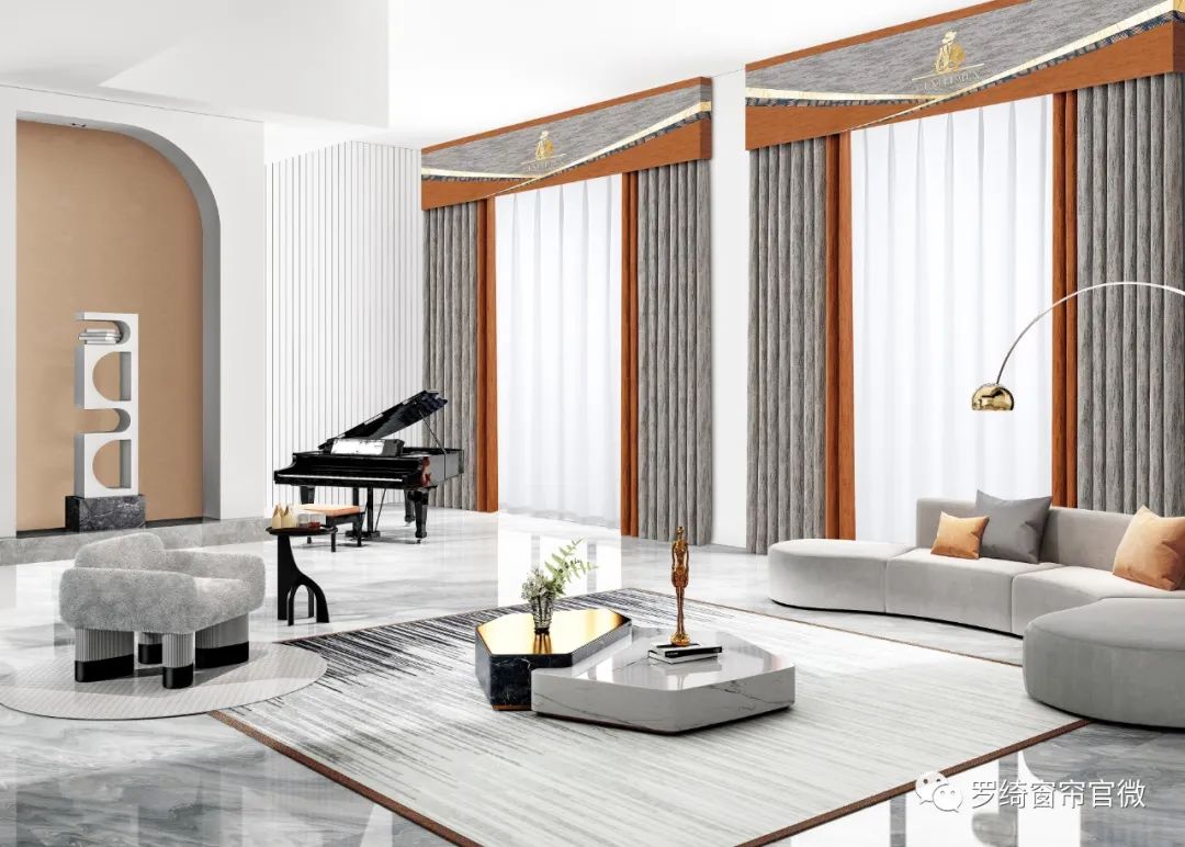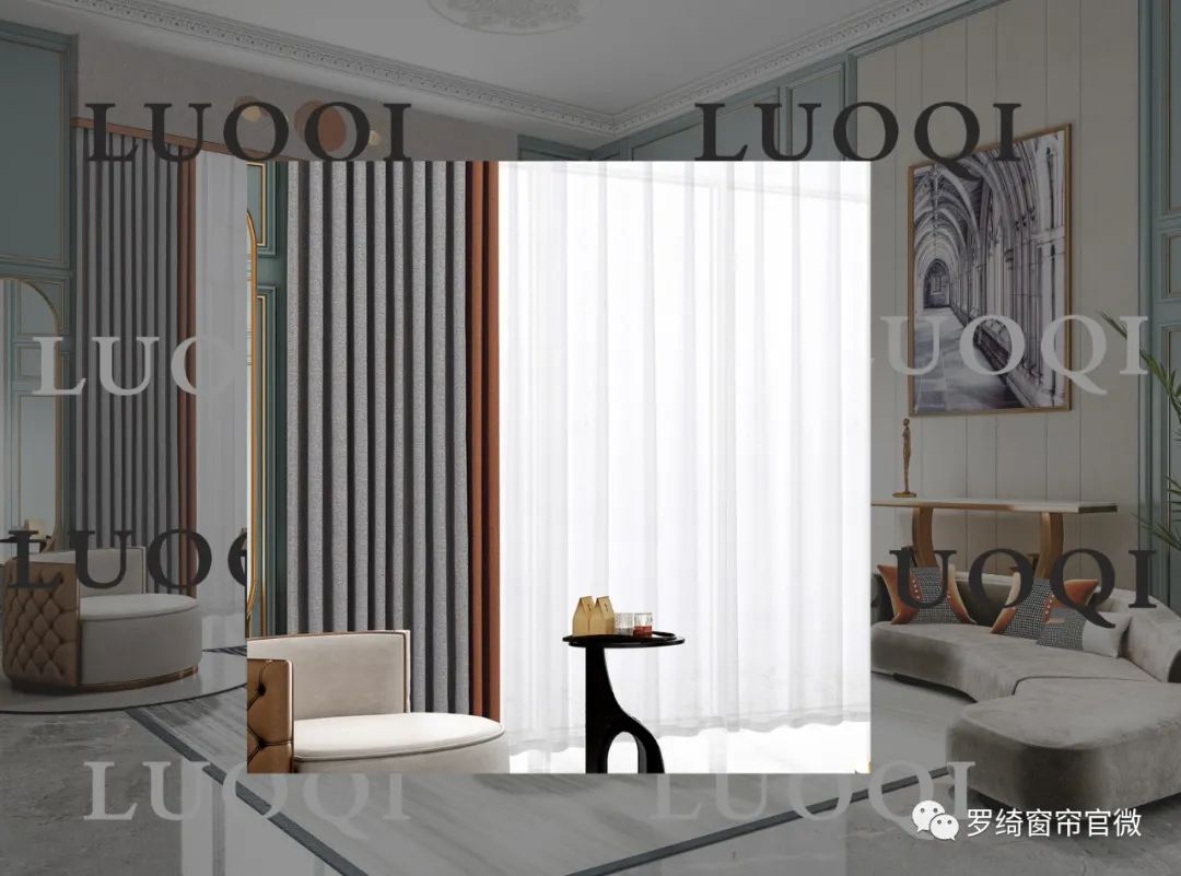 這一款窗簾打造的設計理念就是溫暖的懷舊主義。整個窗簾都透露出一種慵懶和親密的色澤。包括這種肌理的清晰度,有一種原始斑駁的大理石效果,在視覺和觸覺效果上都特別突出。